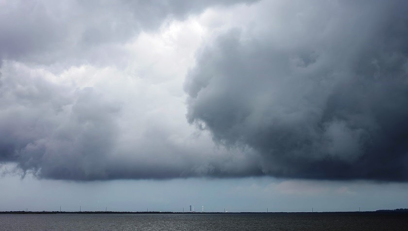 Las nubes de tormenta rodean al SpaceX Falcon 9 Crew Dragon antes de su despegue programado desde el complejo de lanzamiento 39A en el Centro Espacial Kennedy