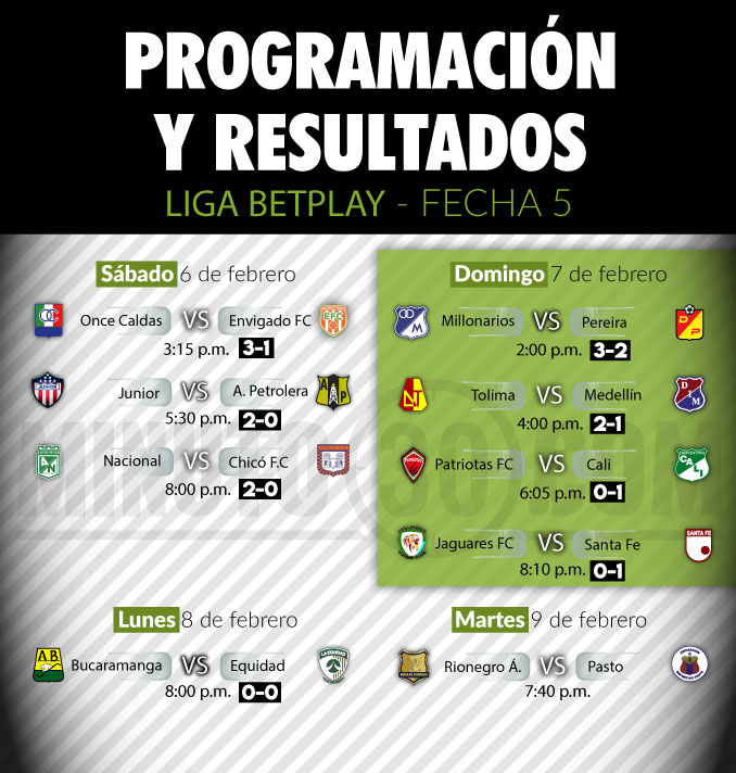 La quinta fecha de la Liga concluirá este martes con el partido entre Águilas Doradas y Deportivo Pasto, que se enfrentarán a partir de las 7:40 de la noche en el Estadio Alberto Grisales.