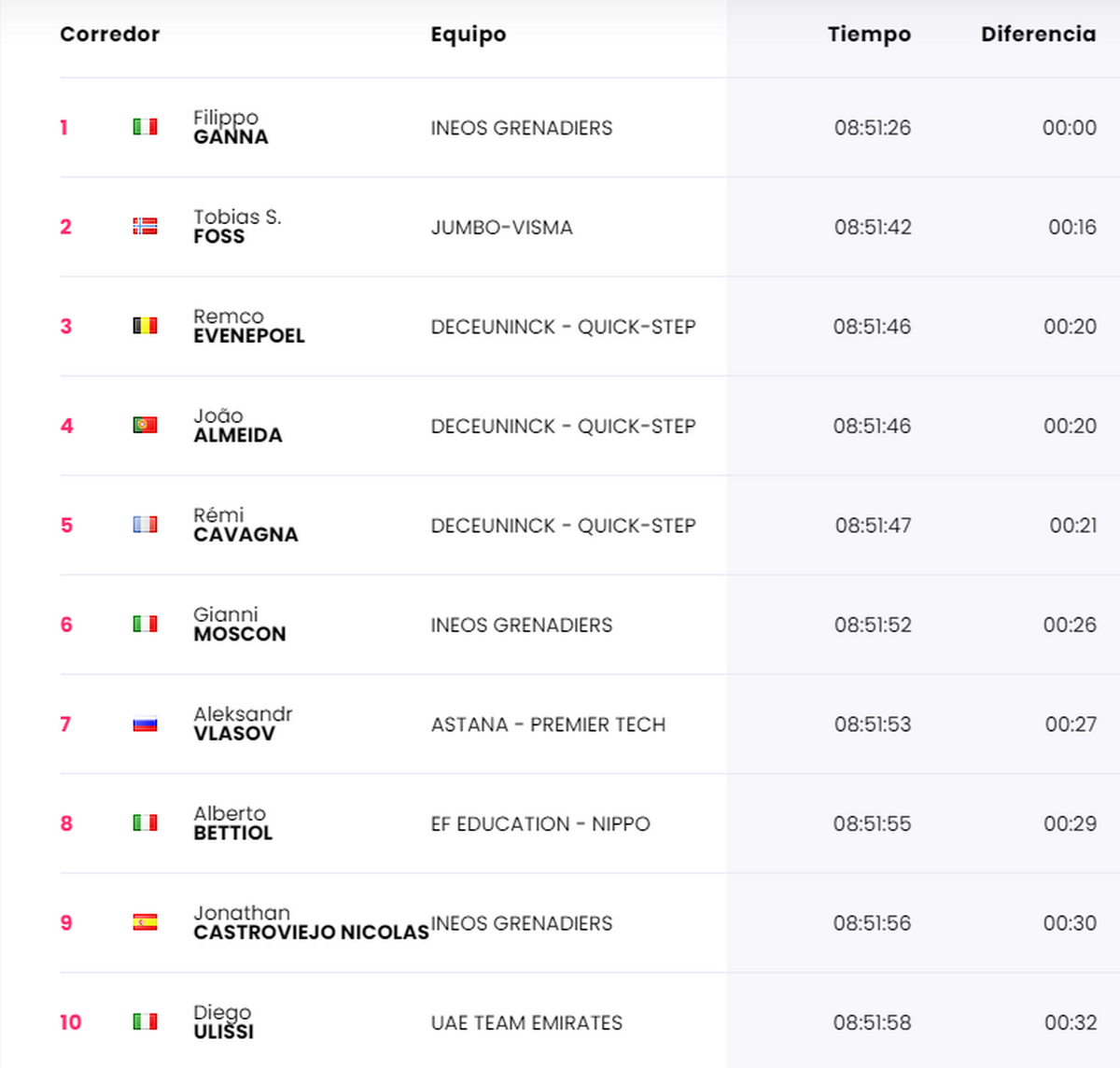 La clasificación general no tuvo novedades en la parte alta y mantiene en el primer lugar a Filippo Ganna.