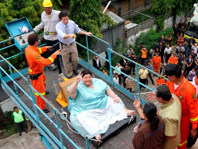 Las autoridades de Bangkok emplearon hoy una grúa y derribaron dos paredes para poder sacar de su casa y llevar al hospital a una mujer tailandesa de 274 kilos que necesitaba una cura urgente por un tumor en la pierna.