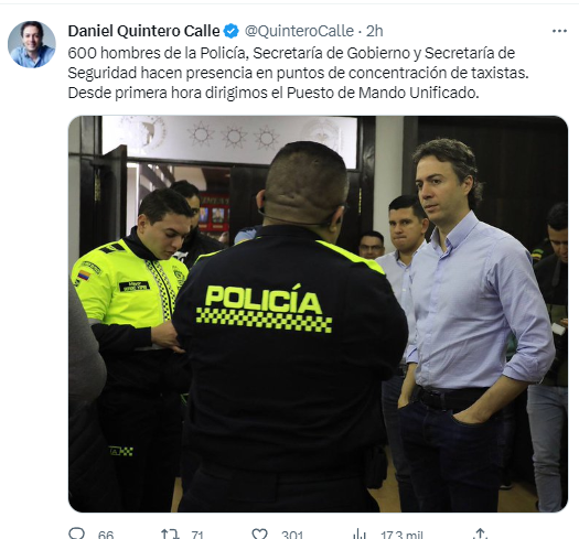Cabe resaltar que el alcalde de Medellín, Daniel Quintero, anunció que 600 hombres de la Policía, Secretaría de Gobierno y Secretaría de Seguridad hacen presencia en puntos de concentración de taxistas.