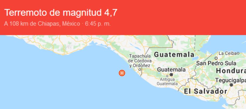 El de México fue un movimiento telúrico en aguas cercanas a Chiapas, estado del sureste de México que limita con Guatemala. Con una magnitud de 4.7 grados en la escala de Richter, con epicentro en el mar ubicado a 108 kilómetros de Chiapas y con una profundidad cercana a los 35 kilómetros, se registró a las 6:45 de la tarde.