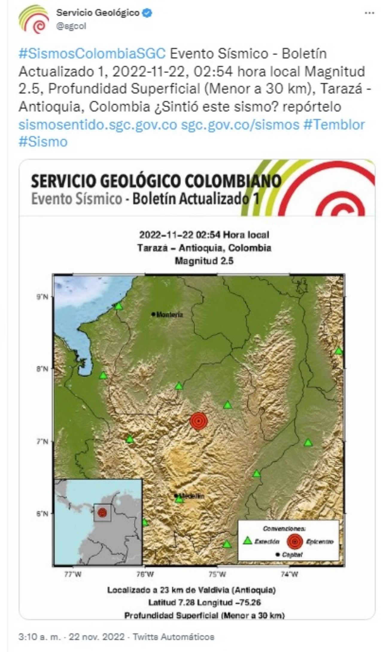 Este martes 22 de noviembre algunos habitantes de Tarazá – Antioquia– sintieron un leve sismo.