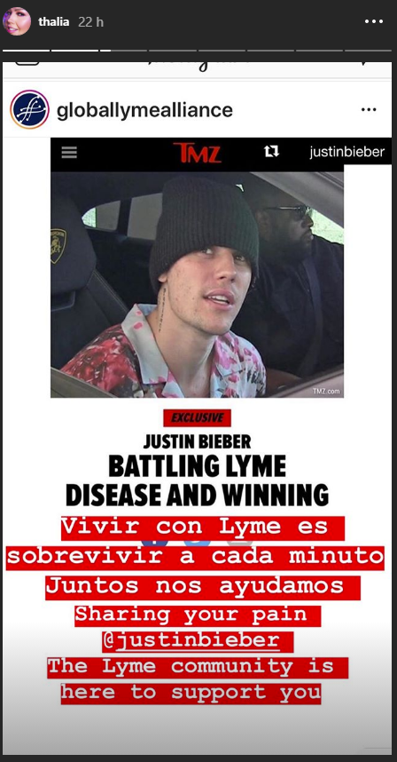 La mexicana fue diagnosticada con este mal hace más de una década y por eso se solidarizó con el canadiense, diciéndole que no está solo. “Vivir con Lyme es sobrevivir a cada minuto. Juntos nos ayudamos. Comparte tu dolor @justinbieber. La comunidad Lyme está aquí para ayudarte”, afirmó Thalía a través de sus redes sociales.