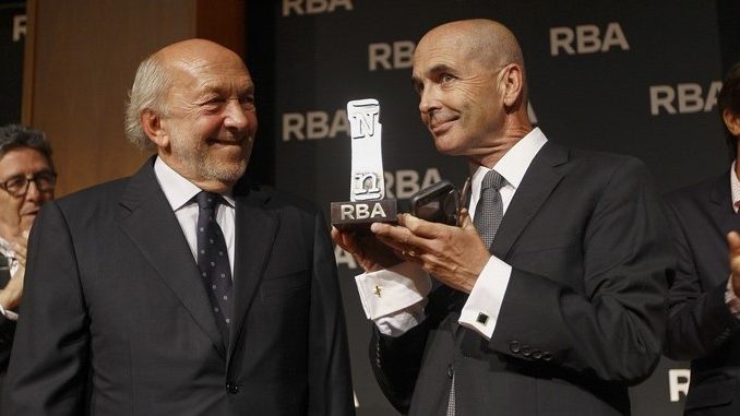 Don Winslow (d) recibe de manos del presidente de RBA, Ricardo Rodrigo (i), la IX edición del Premio Internacional RBA de Novela Negra por su obra la obra El cártel, en septiembre de 2015. EFEArchivo