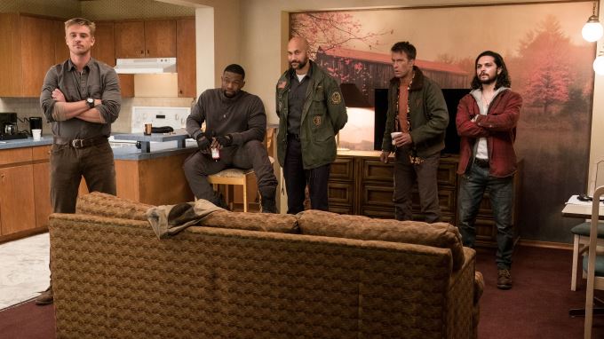 Fotograma cedido por Twentieth Century Fox hoy, martes 11 de septiembre de 2018, donde aparecen los actores (i-d) Boyd Holbrook como Quinn McKenna, Trevante Rhodes como Nebraska Williams, Keegan Michael-Key como Coyle, Thomas Jane como Baxley y Augusto Aguiliera como Nettles, durante una escena de “The Predator”, a estrenarse el 14 de este mes en Estados Unidos, América Latina y España. EFE/Kimbery French/Twentieth Century Fox