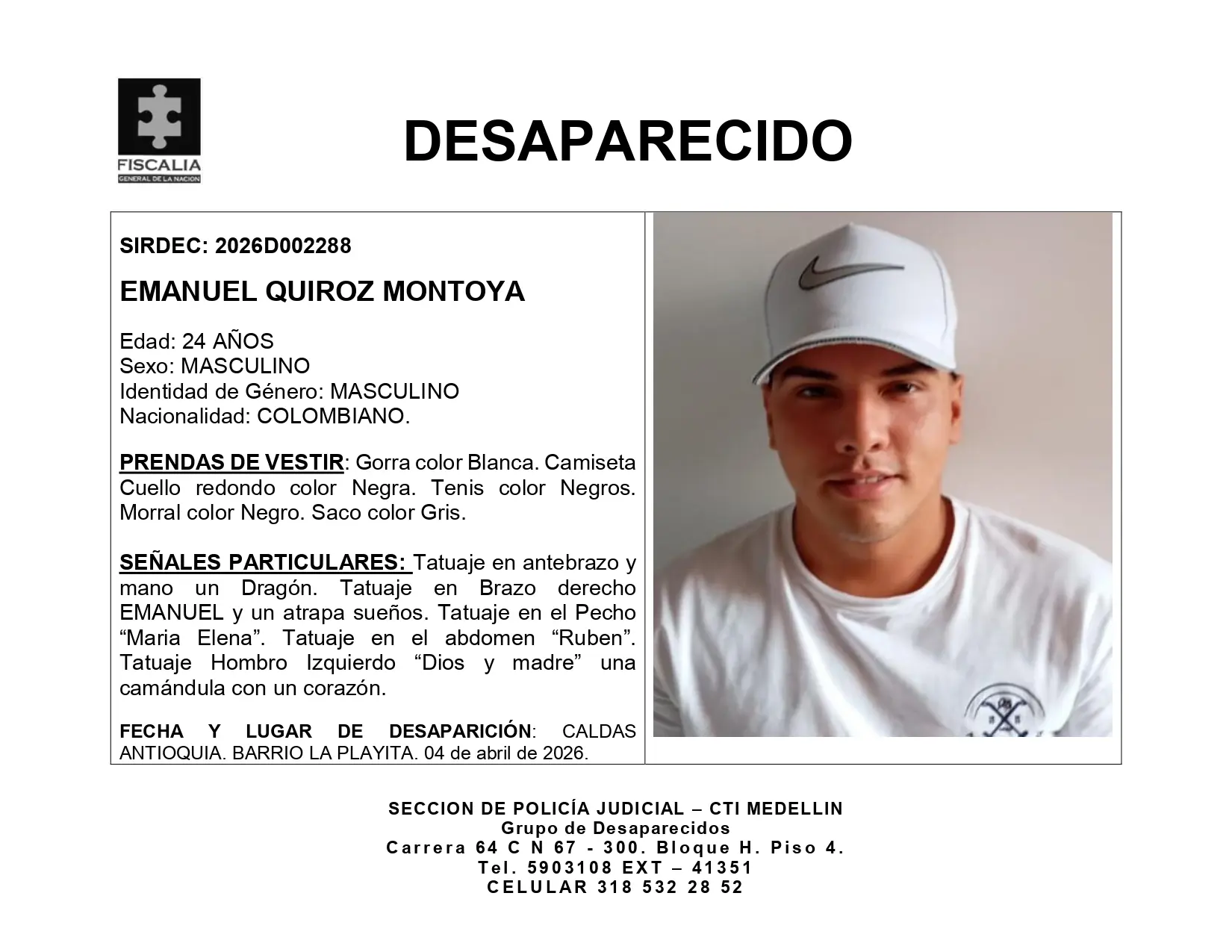 De acuerdo con el reporte oficial instaurado por sus familiares, Emanuel fue visto por última vez el pasado sábado, 04 de abril de 2026, en el sector del barrio La Playita, ubicado en el municipio de Caldas (Antioquia). El joven cuenta con múltiples tatuajes en su cuerpo, los cuales son la clave principal para que cualquier ciudadano pueda identificarlo y dar aviso a las autoridades.