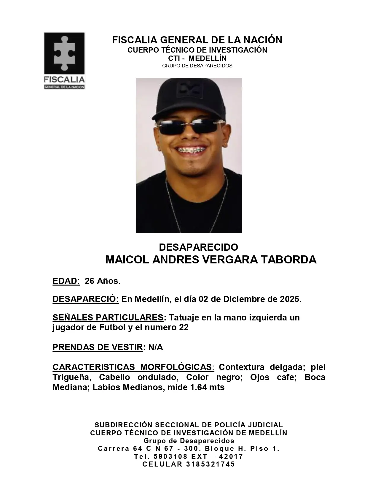 Cualquier persona que posea información sobre el paradero de Maicol Andrés Vergara Taborda debe comunicarse de inmediato con el Grupo de Desaparecidos de la Fiscalía General de la Nación a los números: teléfono fijo 5903108 (extensión 42017) o al celular 3185321745.