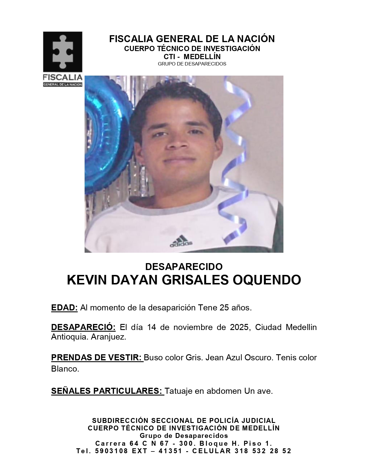 El joven de 25 años de edad se encuentra desaparecido desde el pasado 14 de noviembre de 2025. La última vez que fue visto fue en el barrio Aranjuez, en la ciudad de Medellín, Antioquia.
