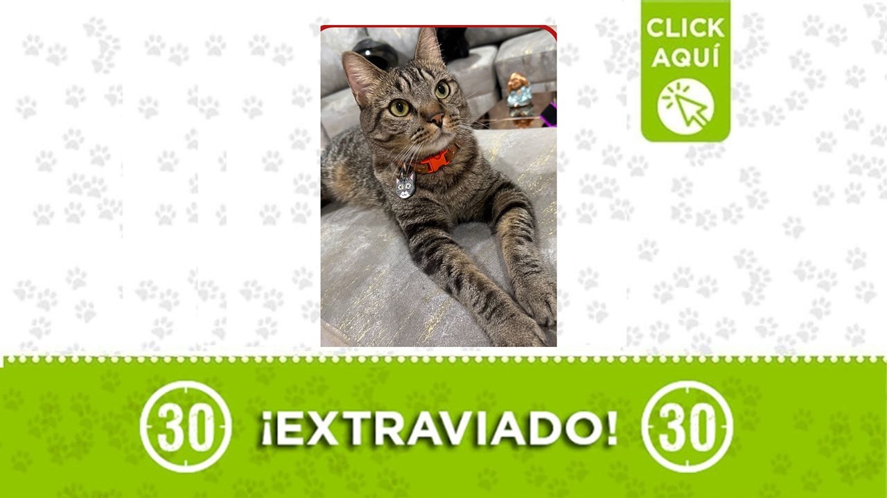 Resumen: ¿Has visto a Tigre? Gatico extraviado en Santa Mónica, visto por última vez el 19 de junio. Lleva collar naranja, piel atigrada y está castrado. Comunícate al whatsapp.