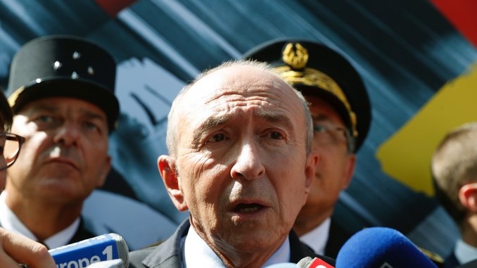 El ministro del Interior francés, Gérard Collomb, realiza declaraciones a los periodistas momentos antes del inicio de la Vuelta a España 2017, en Nimes (Francia). EFE