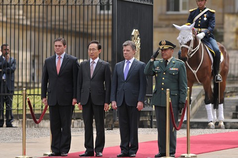 Bogotá – 25 de junio de 2012 | Foto: César Carrión – SIG | El Presidente de Corea del Sur, Lee Myung-Bak, aplaude al Batallón Guardia Presidencial acompañado por el Jefe de Estado, Juan Manuel Santos. El Mandatario visitante recibió honores este lunes en la Plaza de Armas de la Casa de Nariño.