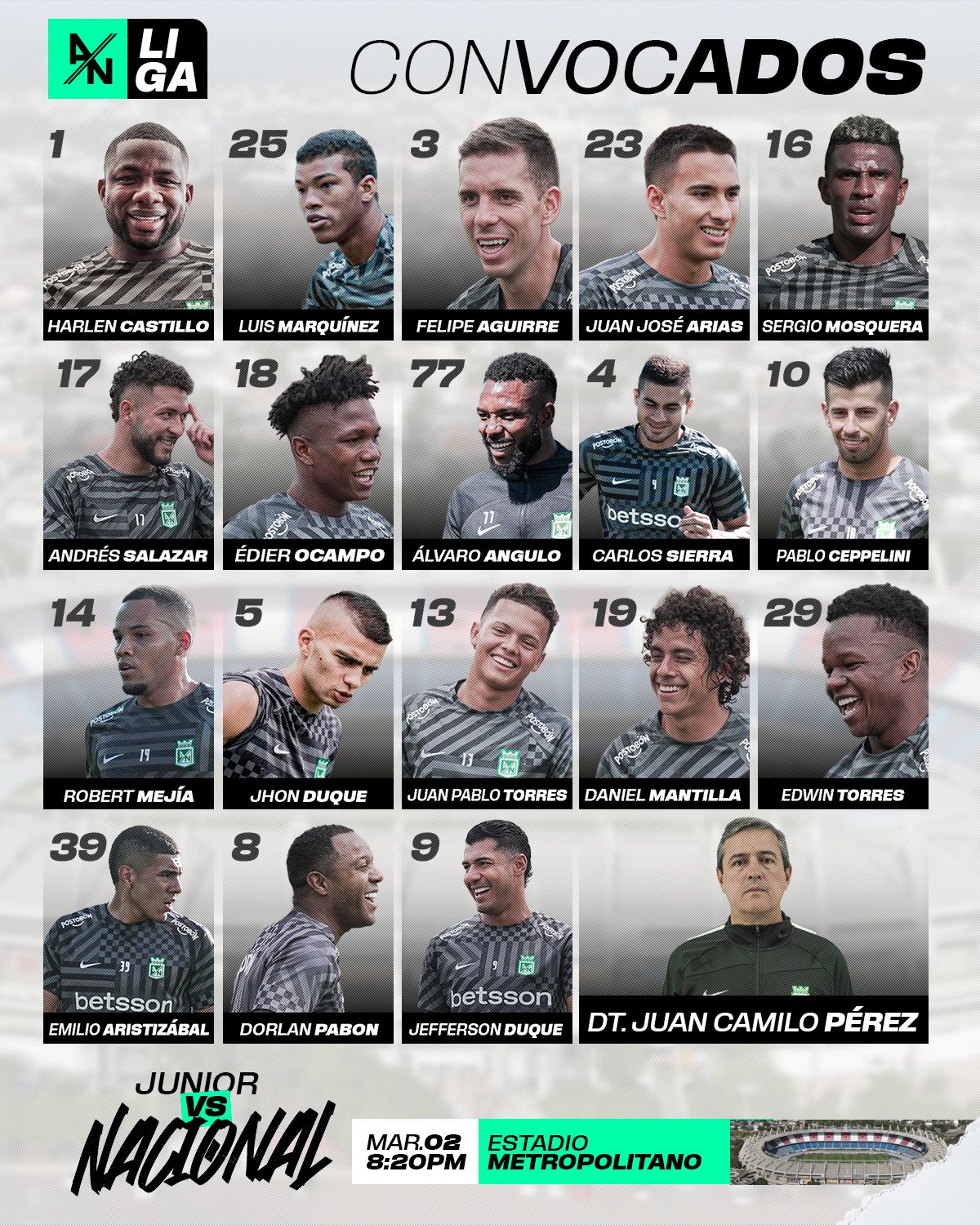 Convocados de Atlético Nacional para enfrentar a Junior.