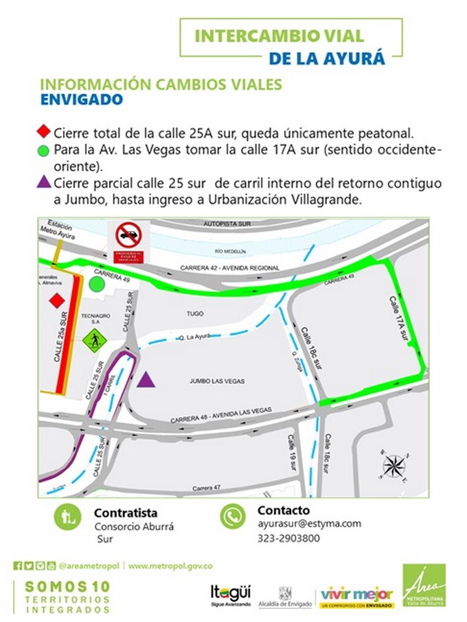 En Envigado se programó el cierre total de la calle 25A sur, dejándola únicamente peatonal, con el fin de permitir la construcción de las pilas de apoyo del puente. Los vehículos que frecuentan esta vía podrán tomar la calle 17A sur para que puedan continuar su trayecto.