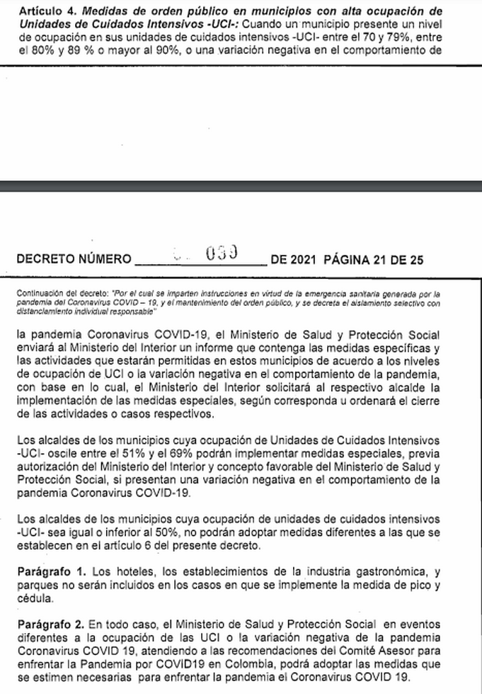 “Cuando un municipio presente un nivel de ocupación en sus unidades de cuidados intensivos -UCI- entre el 70 y 79%, entre el 80% y 89 % o mayor al 90%, o una variación negativa en el comportamiento de la pandemia Coronavirus COVID-19, el Ministerio de Salud y Protección Social enviará al Ministerio del Interior un informe que contenga las medidas específicas y las actividades que estarán permitidas en estos municipios de acuerdo a los niveles de ocupación de UCI o la variación negativa en el comportamiento de la pandemia, con base en lo cual, el Ministerio del Interior solicitará al respectivo alcalde la implementación de las medidas especiales, según corresponda u ordenará el cierre de las actividades o casos respectivos”.
