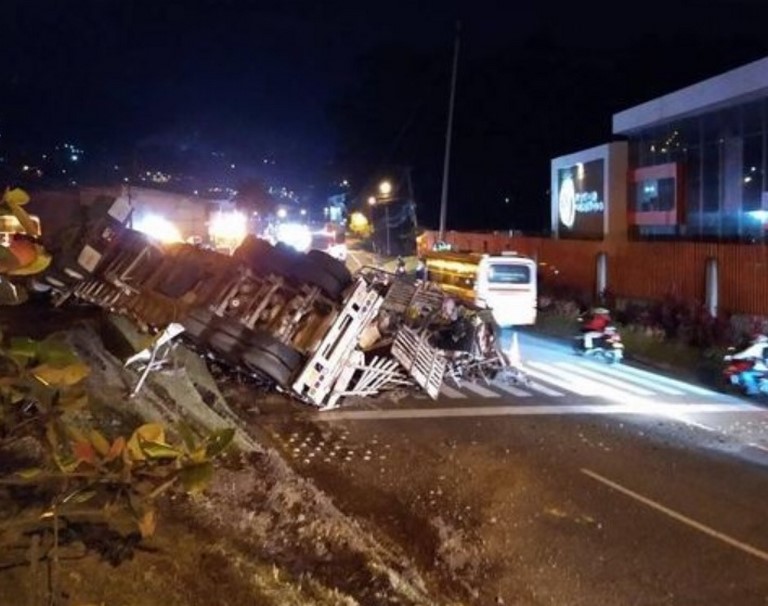 En la noche del pasado viernes 19 de febrero, una tractomula se volcó en la variante a Caldas -sentido norte-sur- cerca a una colchonería y a las redes sociales de Minuto30 llegaron imágenes de lo sucedido.
