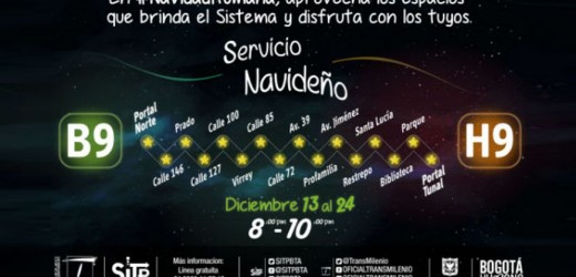 Hasta el 24 de este diciembre de 2014, entre las 8:00 y las 10:00 p.m., el Sistema TransMilenio pondrá en operación la Ruta de la navidad B9-H9, la cual contara con 16 paradas entre el Portal Norte y el Portal Tunal.