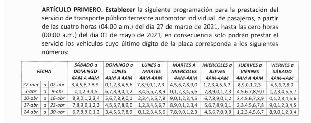 De acuerdo a la secretaría de Movilidad, la Resolución implementará desde mañana y hasta el 30 de abril un nuevo pico y placa para taxis. Serán siete dígitos todos los días, a excepción del 1, 2 y 3 de abril, fechas en las que regirán seis.