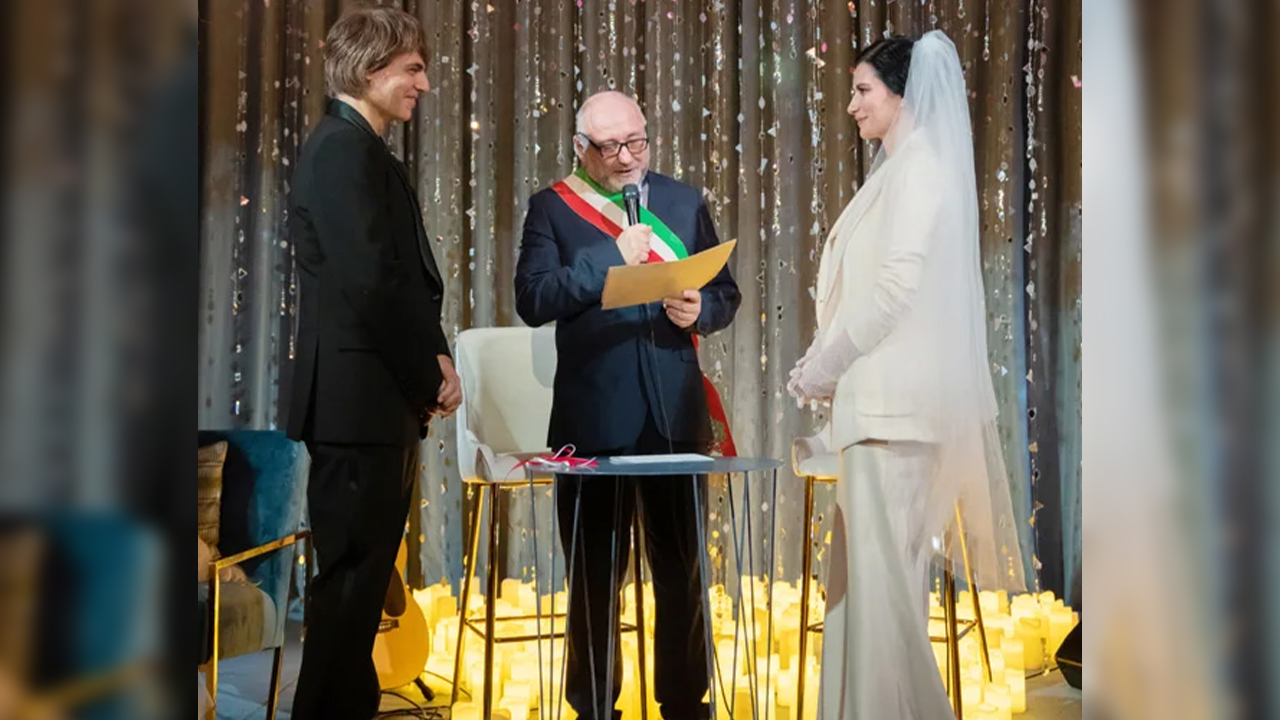 Laura Pausini, de 48 años, llevaba un vestido largo blanco, con blazer al tono y la melena recogida en un moño con velo. Completó su ‘look’ nupcial con unos guantes de plumeti y unos zapatos de pulsera. Además del anillo de recién casada, lucía unos pendientes y un collar de perlas. Paolo Carta, de 58 años, apostó por un estilismo más informal en color negro.