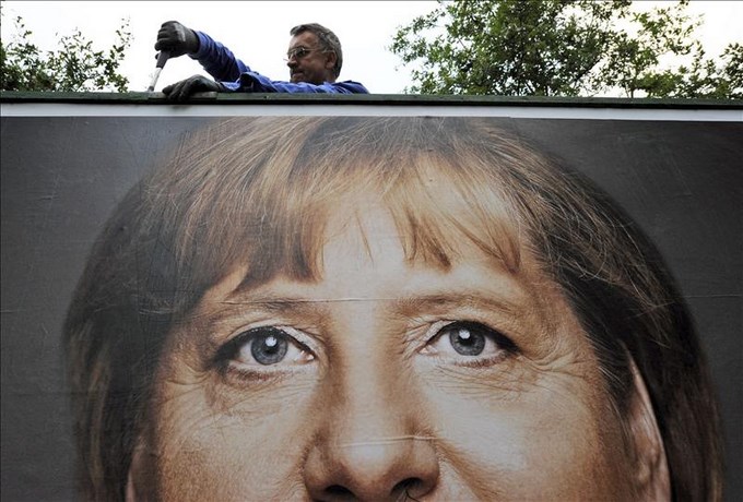 Un trabajador retira hoy un cartel electoral con el rostro de la canciller alemana, Angela Merkel, en Itzehoe (Alemania). EFE