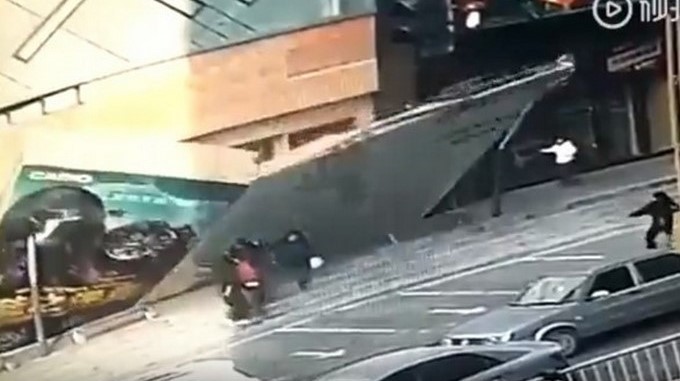 Debido a las fuertes vientos que se han presentado en la ciudad de Changchún, China, provocaron la caída de una valla publicitaria encima de cuatro personas que transitaban por la acera.