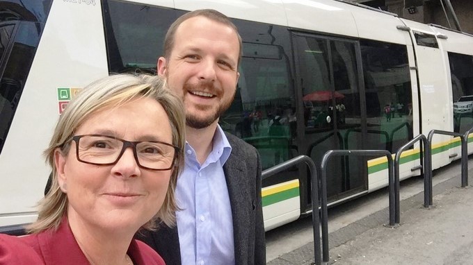 La embajadora de la Unión Europea en Colombia Patricia Llombart estuvo de visita en Medellín y aprovechó para hacerse una selfie en el centro de la ciudad justo cuando pasaba el Tranvía de Ayacucho.