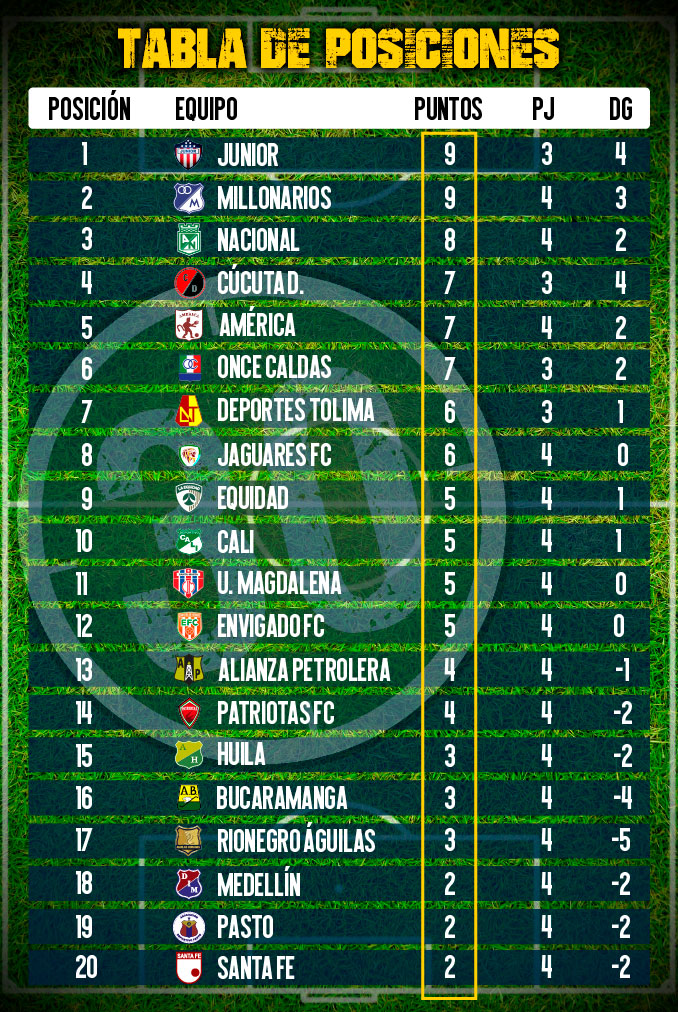 Minuto30.com- Atlético Junior, Millonarios y Atlético Nacional, que hacen parte de los denominados equipos grandes de Colombia, se ubican en su orden en los tres primeros puestos de la tabla de posiciones de la Liga Águila I-2019, cumplidas cuatro jornadas del campeonato.