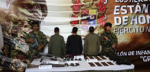Se trata de alias ‘Leo’, con más de ocho años en las filas de Farc, de alias ‘Yimmy’ y de alias ‘Camilo’, quienes se entregaron con tres fusiles -un AK-47, un galíl 7.62 y un M14-, 12 proveedores, 461 cartuchos calibre 7.62, una granada de mano y material de intendencia.