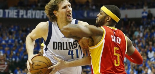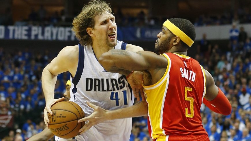 Dirk Nowitzki (i), de los Dallas de Mavericks, intenta encestar ante la oposición del jugador de los Houston Rockets Josh Smith (d), hoy en Dallas. EFE