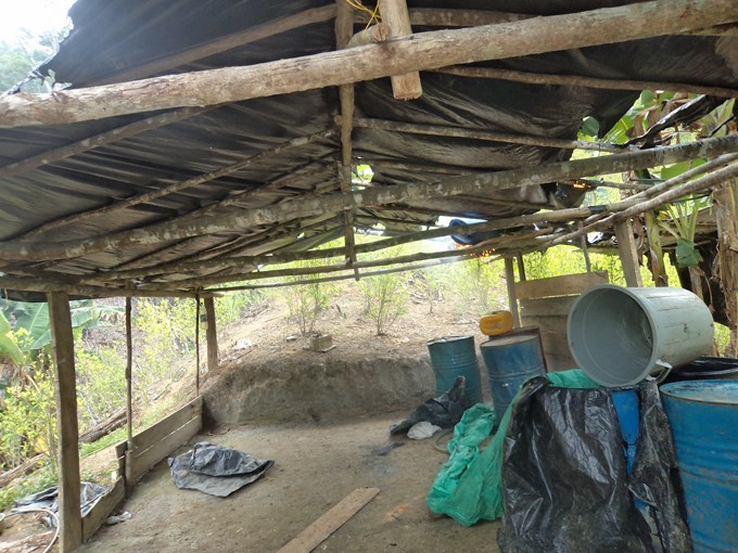 En este laboratorio que se presume le pertenecía a la banda criminal de’Los Urabeños’, fueron hallados 160 galones de gasolina misturada, 110 galones de insumos líquidos sin establecer , 200 kg de urea y 10 canecas entre plásticas y metálicas .Dichos elementos y materiales eran utilizados en el proceso de la producción del alcaloide.