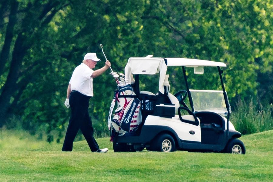 Vistiendo camiseta y gorra blanca, Trump fue visto este sábado jugando su deporte favorito en su club en Sterling (Virginia), a las afueras de Washington, en la primera visita a unas de sus propiedades desde marzo pasado.
