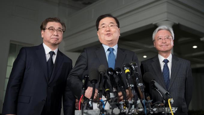“El presidente Trump agradeció la reunión informativa y dijo que se reunirá con Kim Jong-Un en mayo para lograr una permanente desnuclearización”, dijo Chung Eui-yong en una breve comparecencia de prensa.