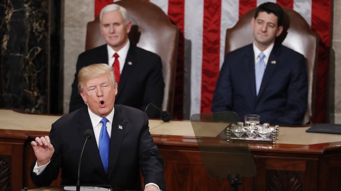 El presidente estadounidense Donald Trump (c) pronuncia su discurso sobre el Estado de la Unión ante el Congreso acompañado por el vicepresidente Mike Pence (i) y el presidente de la Cámara de Representantes Paul Ryan (d), en Washington. EFE