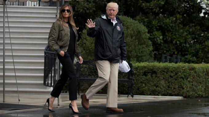 El presidente de Estados Unidos, Donald J. Trump (d), y su esposa, Melania Trump (i), fueron registrados este martes a la salida de la Casa Blanca, en Washington D.C (EE.UU.), antes de emprender un viaje al estado de Texas, afectado por el paso del huracán Harvey. EFE