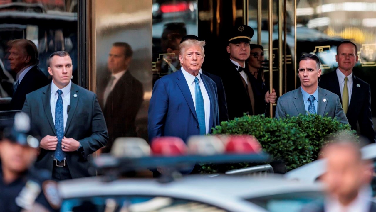 El expresidente de EE. UU. Donald J. Trump (C) sale de la Torre Trump camino a la oficina de la Fiscal General de Nueva York. EFE/Justin Lane/ Pool