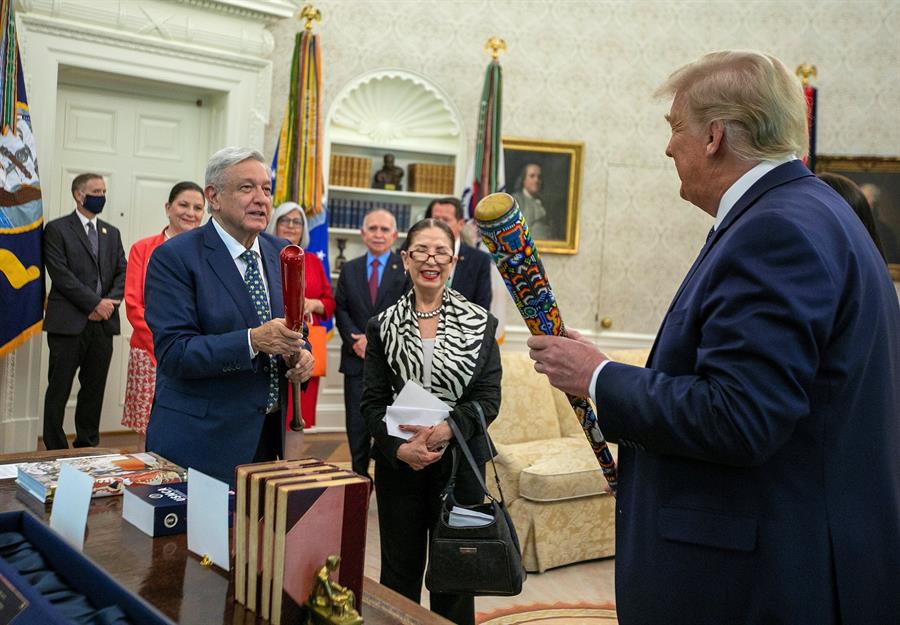 El presidente de Estados Unidos, Donald Trump, y su homólogo mexicano, Andrés Manuel López Obrador, se obsequiaron este miércoles bates de béisbol como regalos protocolarios antes de la reunión que ambos mantuvieron en la Casa Blanca.