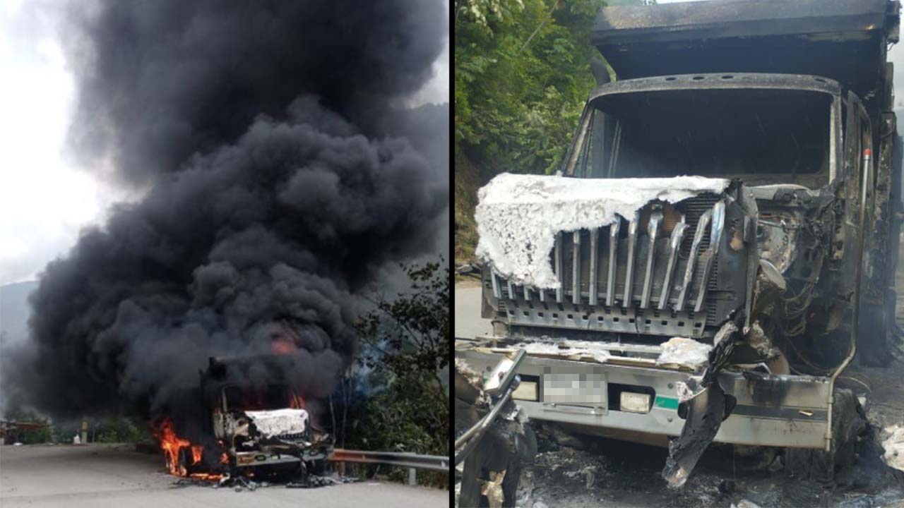Condenamos ataque terrorista a volqueta de la empresa Coinobras, encargada del mantenimiento de vías en #Hidroituango. Hombres armados quemaron el vehículo en sector La Palestina – Ituango. UNIDOS con fuerza pública trabajamos para capturar a los responsables. pic.twitter.com/t07sgbmFMi