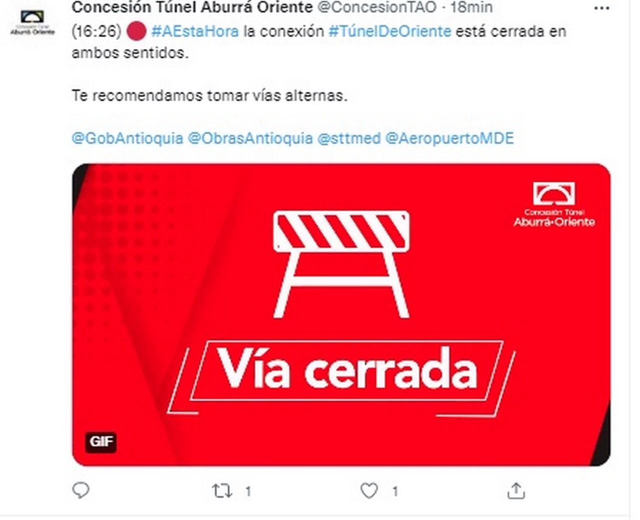 A las 4:26 de la tarde informó a través de la cuenta de Twitter, la Concesión Túnel Aburrá Oriente detalló que se encuentra cerrado al parecer debido a un accidente de tránsito.