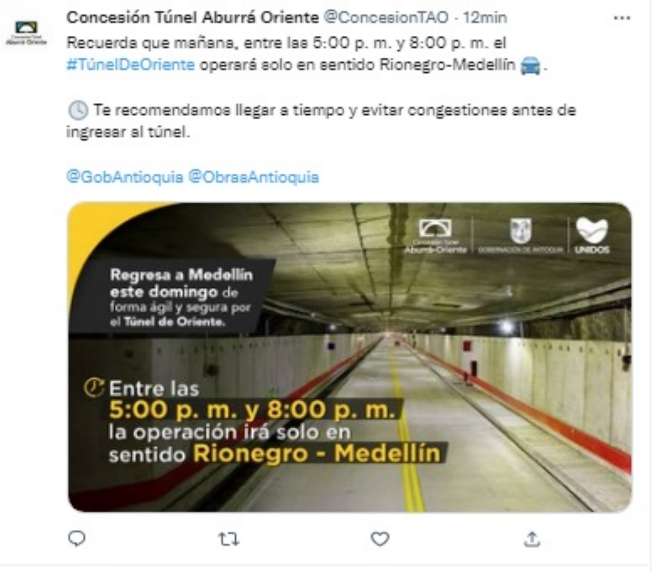 La Concesión Túnel Aburrá Oriente anunció por medio de su cuenta de Twitter el horario que tendrá el corredor el domingo 11 de diciembre.