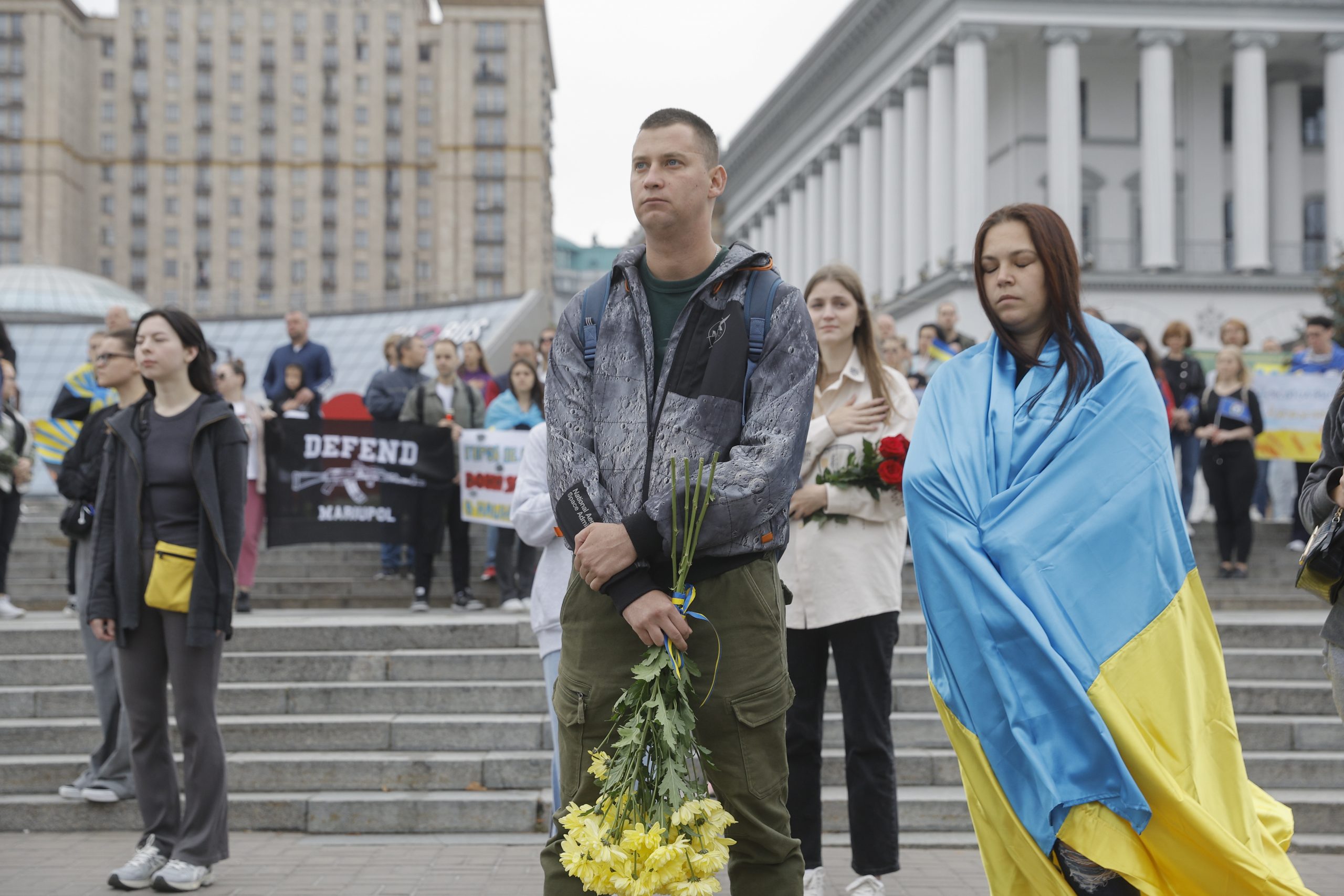 Antes del minuto de silencio, que muchos siguieron con lágrimas en los ojos, algunos de los presentes colocaron flores en el césped cubierto de banderas -cada una de ellas por un soldado muerto en la guerra contra Rusia- que domina uno de los extremos de la plaza de la Independencia de Kiev.
