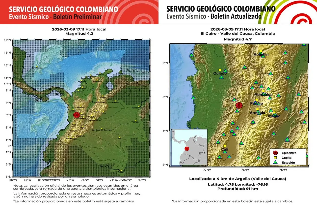 Minuto30.com .- El Servicio Geológico Colombiano (SGC) ha emitido el boletín actualizado tras el fuerte temblor que sacudió al país la tarde de este lunes 9 de marzo. Aunque inicialmente se reportó una magnitud preliminar de 4.2, la revisión técnica oficial confirmó que el sismo tuvo una magnitud de 4.7.