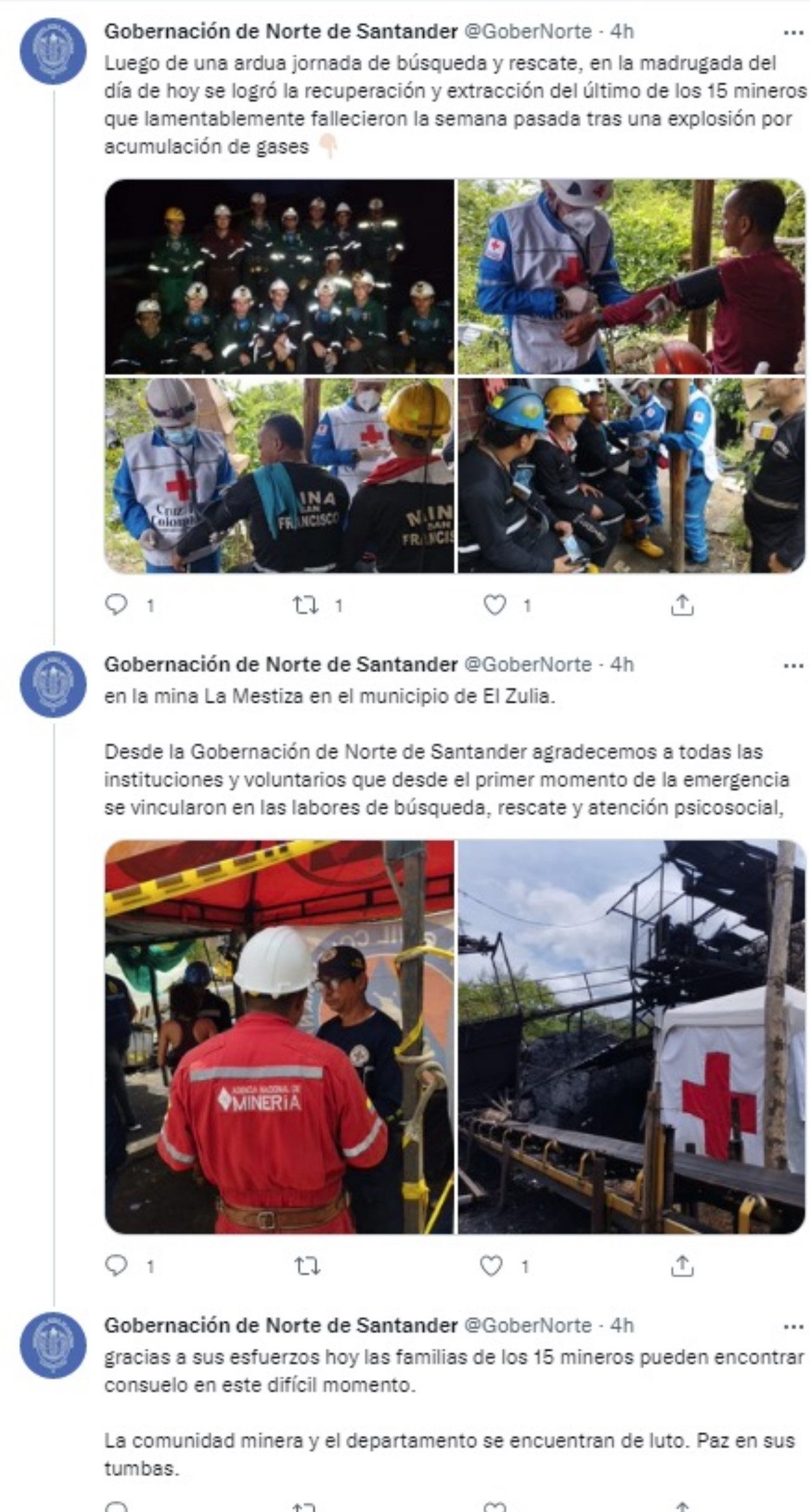 A través de la cuenta de Twitter de la Gobernación de Norte de Santander informaron que “Luego de una ardua jornada de búsqueda y rescate, en la madrugada del día de hoy se logró la recuperación y extracción del último de los 15 mineros que lamentablemente fallecieron la semana pasada tras una explosión por acumulación de gases”.