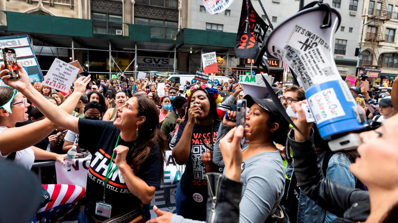 Personas se manifiestan en contra de la vacuna contra la Covid-19 en Nueva York (EE.UU.). EFE/EPA/JUSTIN LANE