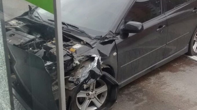 La fuerte colisión del carro gris, Mazda 6, se produjo en la estación de Transmilenio ubicada en la autopista norte ubicada en la calle 114 y a pocas cuadras del eje comercial de la calle 116. La parte delantera del carro quedó destruida.