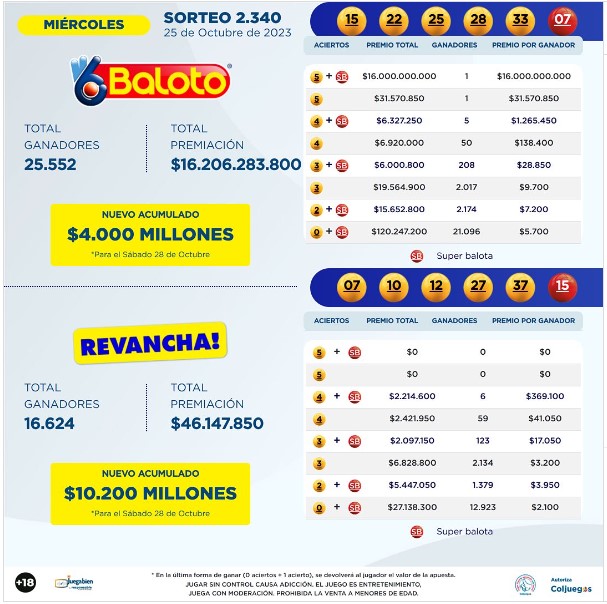 El sorteo número 2.340 de Baloto, dejó en total a 25.552 ganadores, pero entre ellos, solo un ganador del premio mayor, que lo convierte en un nuevo millonario en Colombia.