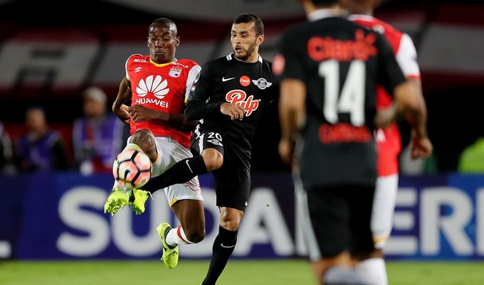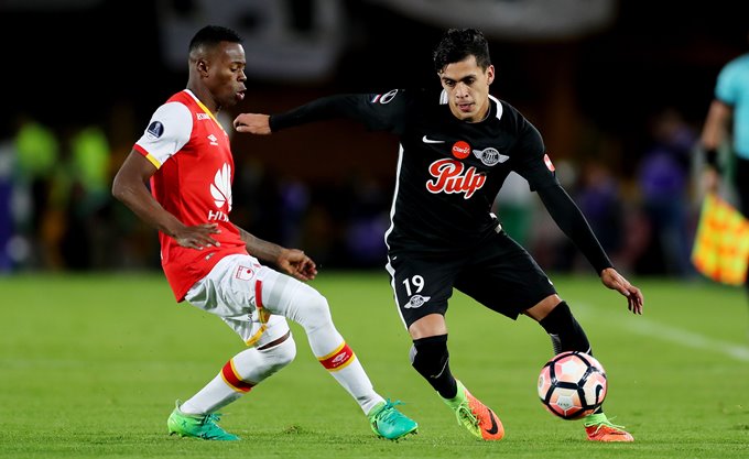 El jugador Javier López (i) de Santa Fe disputa un balón con Antonio Bareiro (d) de Libertad hoy, jueves 14 de septiembre de 2017, durante un partido entre Santa Fe, de Colombia, y Libertad, de Paraguay, por la Copa Sudamericana que se disputa en el estadio Nemesio Camacho “El Campín” de Bogotá (Colombia). EFE
