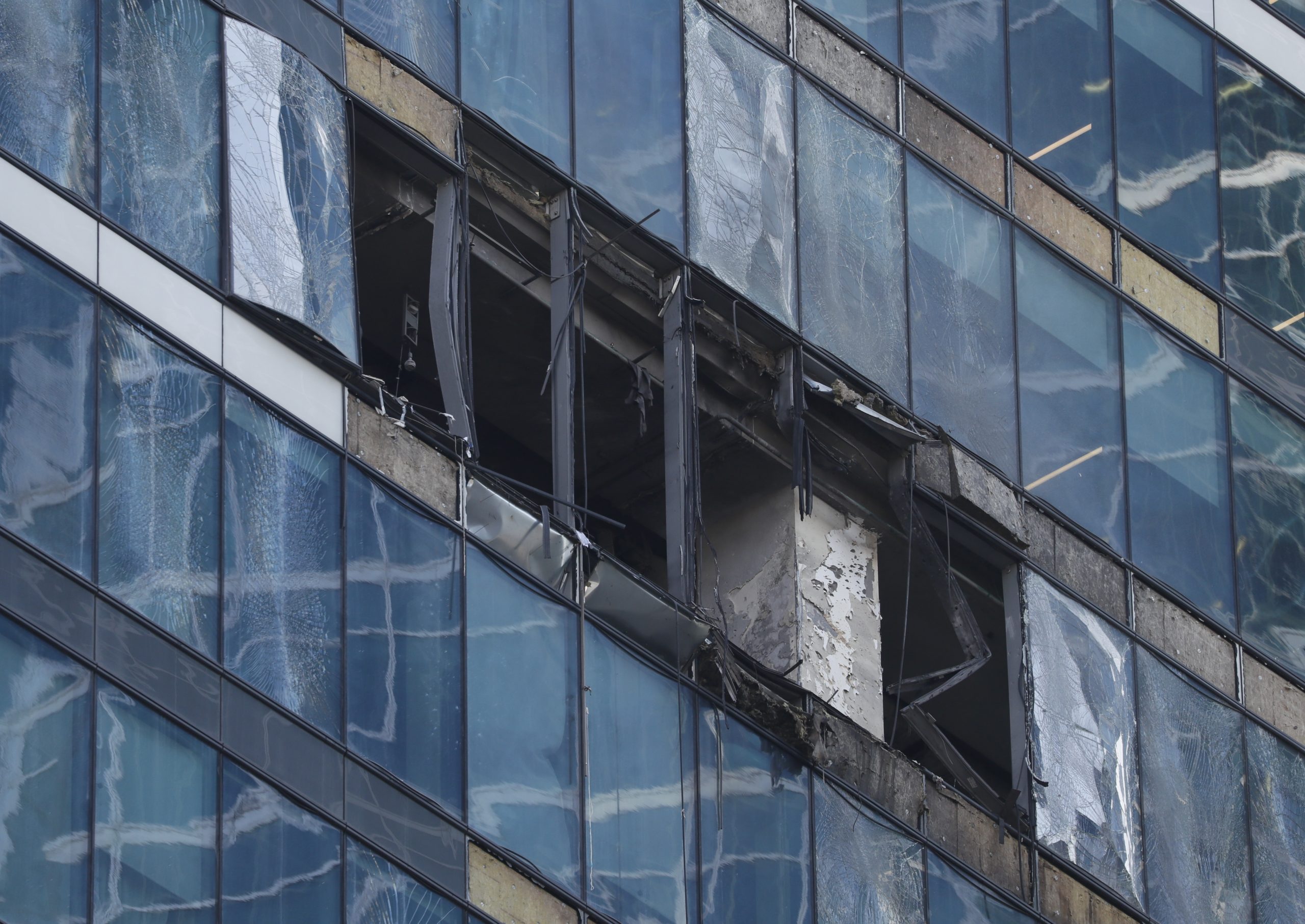 El dron se estrelló con los cristales de la fachada del piso 21 de uno de los rascacielos que conforman el moderno circuito financiero de Moscow City, dos de cuyas torres sufrieron daños el pasado sábado en un ataque similar.