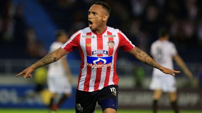 Jarlan Barrera de Junior celebra el gol ante Colón en un juego de los octavos de final de la Copa Sudamericana en el estadio Metropolitano de Barranquilla (Colombia). EFE
