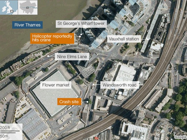 De acuerdo con las primeras informaciones, el aparato colisionó con una grúa en lo alto de un edificio en el barrio de Vauxhall, en la orilla sur del río Támesis, y se precipitó al suelo como una bola de fuego que provocó una gran columna de humo.