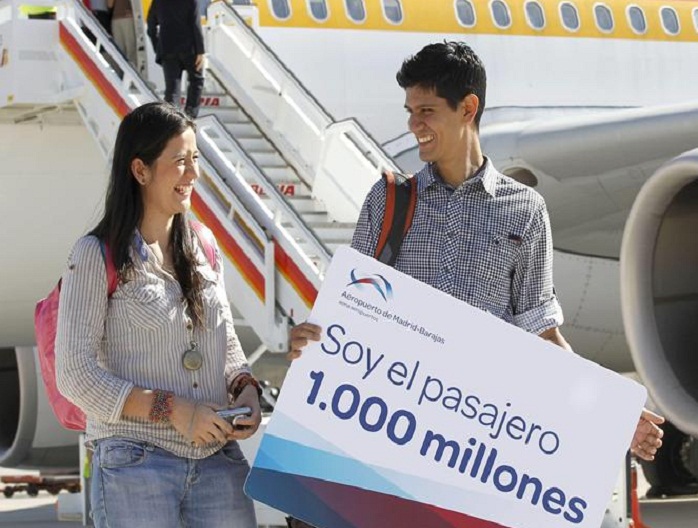 La directora del aeropuerto de Barajas, Elena Mayoral, entregó al joven colombiano una “gran tarjeta” con el lema “Soy el viajero 1.000 millones”, que le da derecho a utilizar las salas Vip de los aeropuertos españoles durante un año.